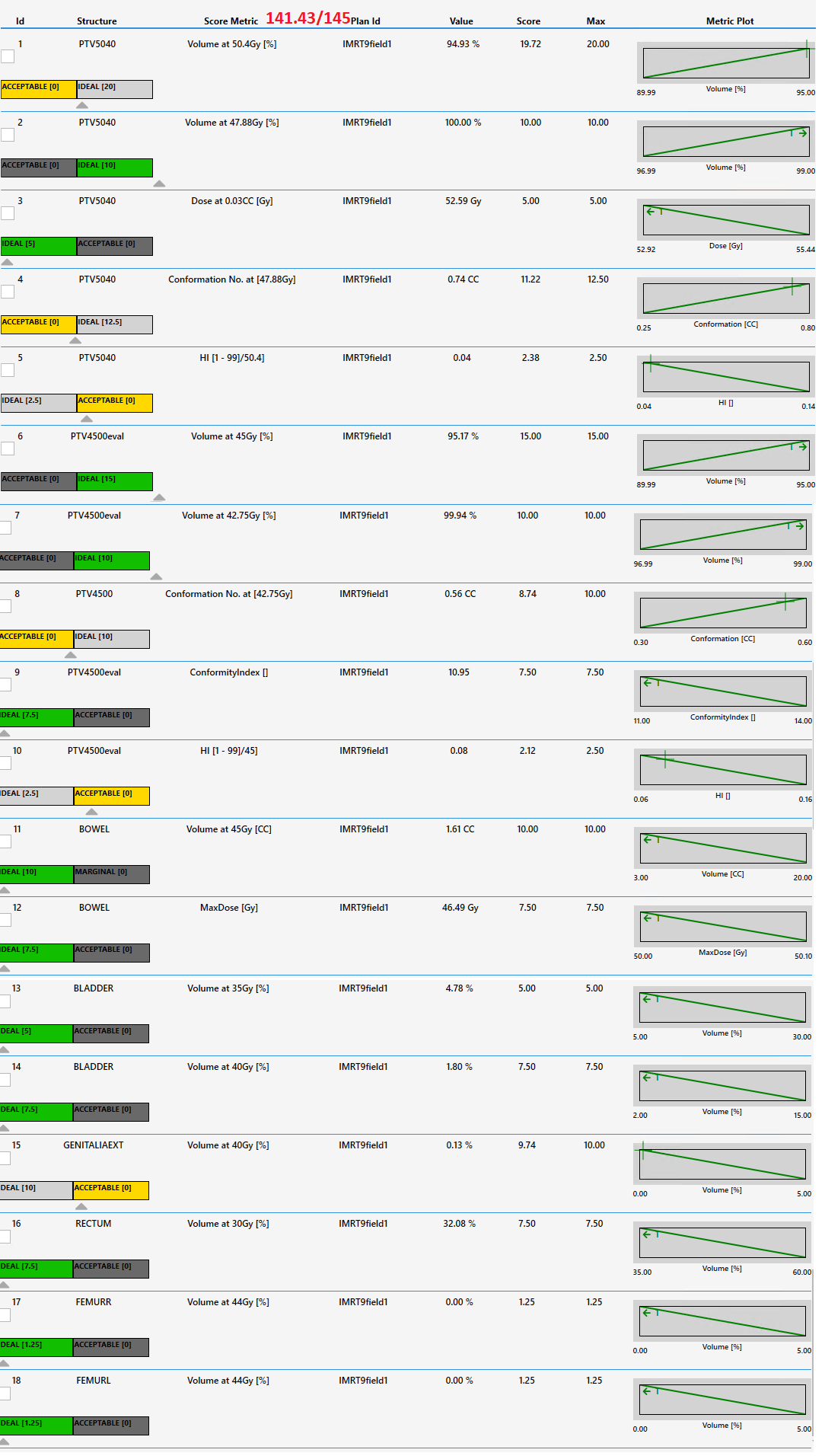 | PTV_5040 | PTV_5040 | V47.88Gy[%] | >=99 | 97 | Goal | 100.00 % | ||