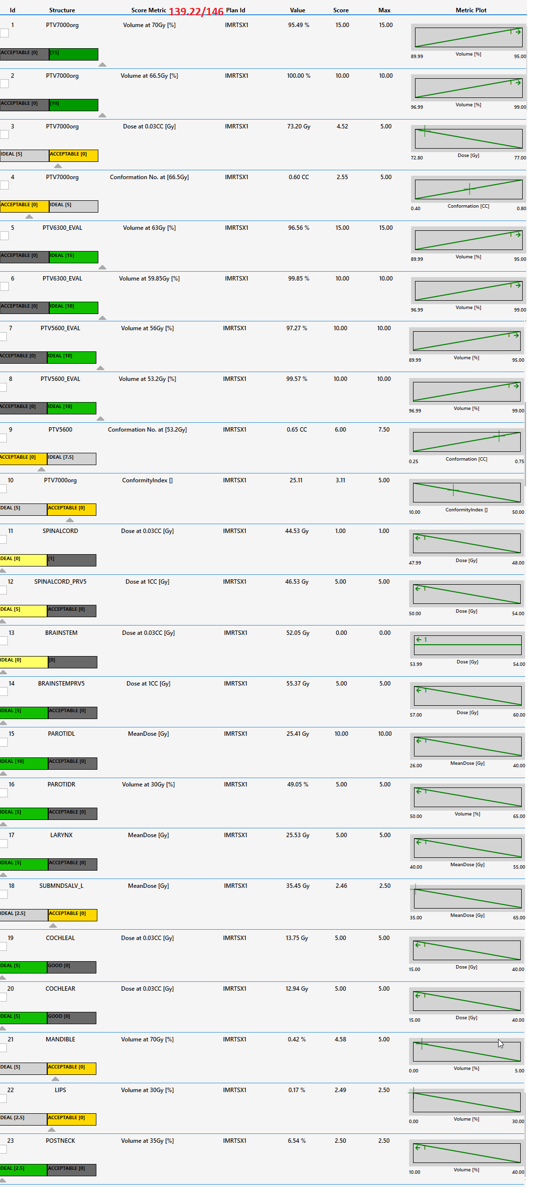 | POST_NECK | POST_NECK | V35.0Gy[%] | <=10 | 40 | Goal | 6.48 % |