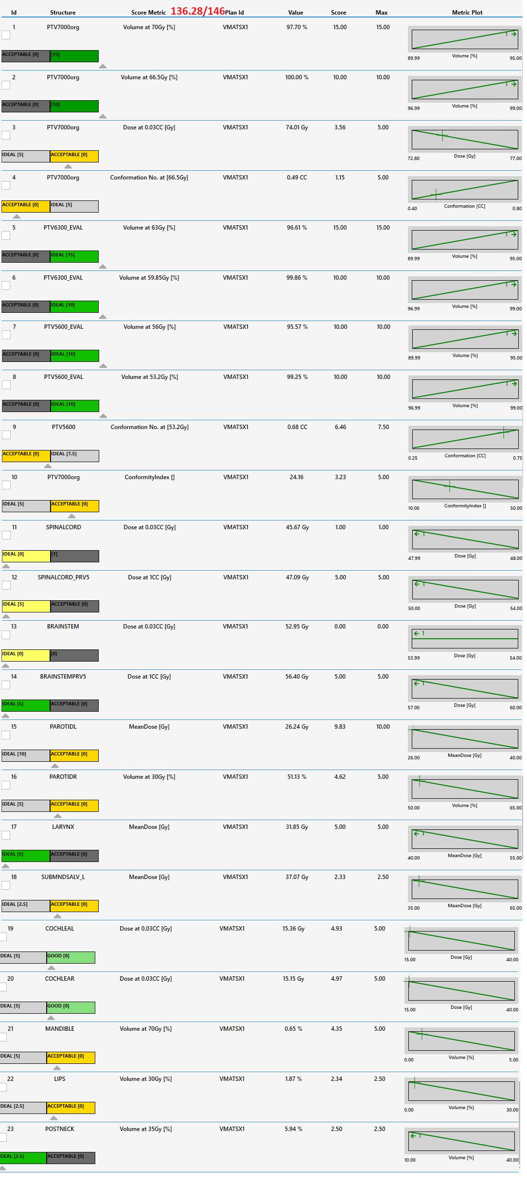 | POST_NECK | POST_NECK | V35.0Gy[%] | <=10 | 40 | Goal | 5.86 % |
