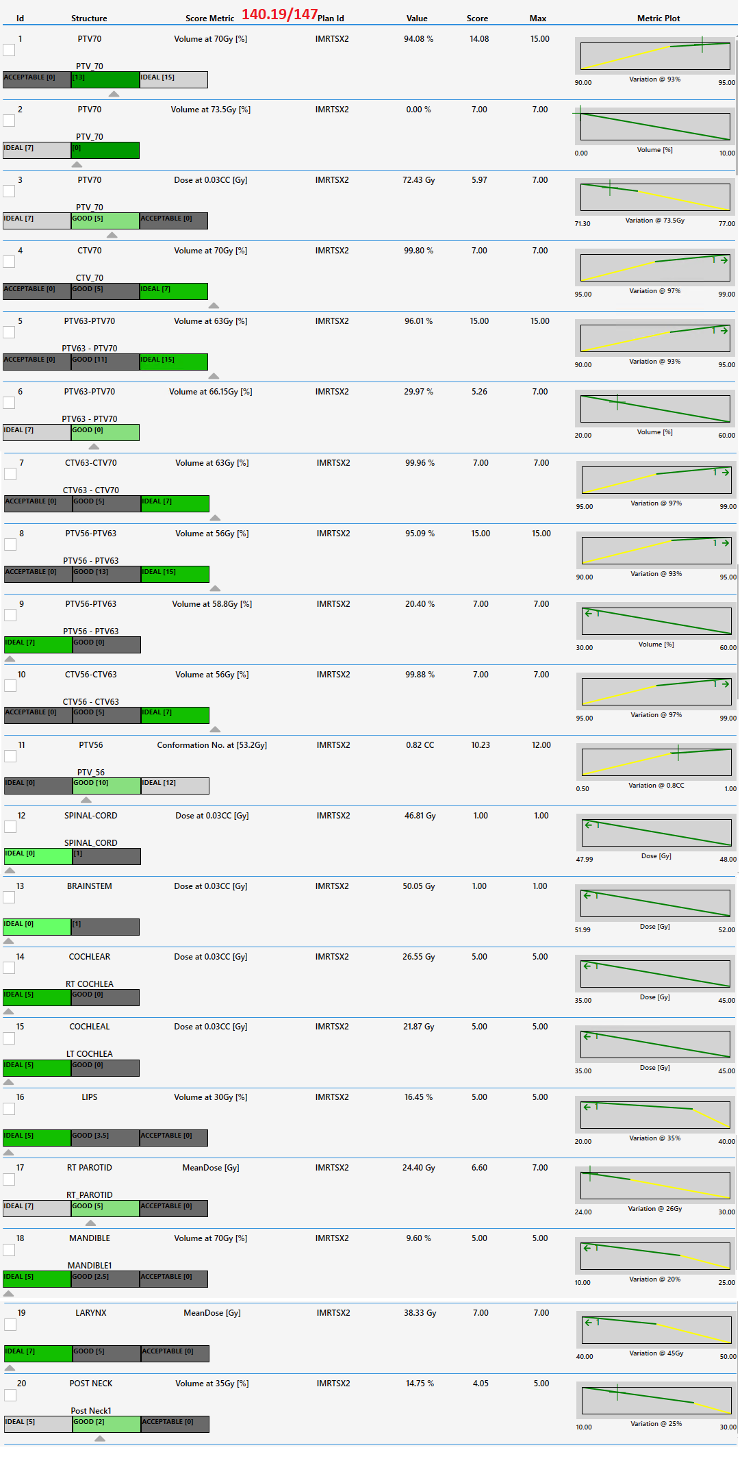 | Post Neck1 | Post Neck1 | V35Gy[%] | <=10 | 30 | Goal | 9.25 % |
