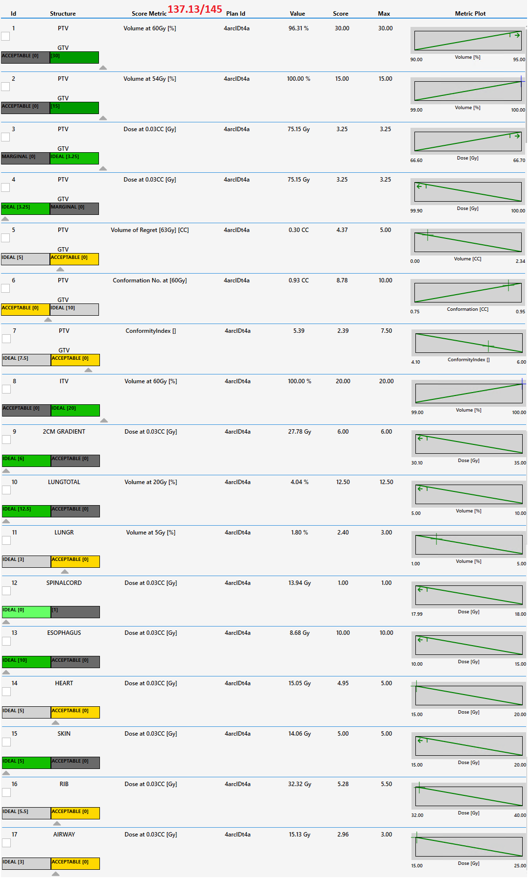 | Structure ID | Structure Code | Patient Structure | DVH Objective | Evaluator | Variation | Priority | Met | Achieved |